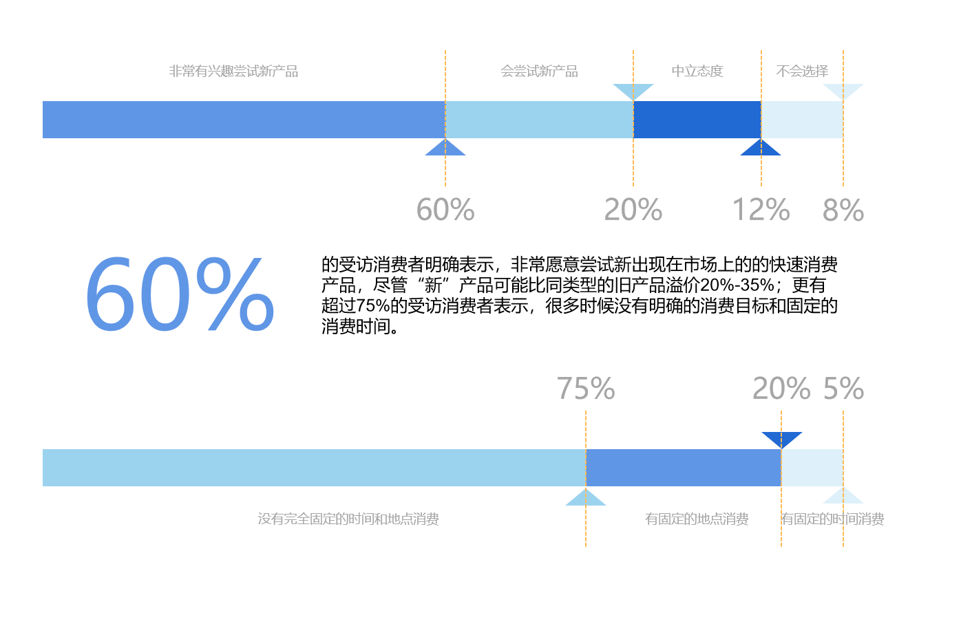 在过去,零售门店铺货是根据有限的市场反馈决定的,一间商铺门店的运营状况,很大程度上取决于商铺门店经营者的市场阅读能力、统筹调配能力和前瞻性眼光。此时,消费者对于产品的需求结构相对单一,市场上商品的丰富程度远不及当下。根据一项针对年龄层在20-50岁的 消费者消费意愿调查:60%的受访消费者明确表示,非常愿意尝试新出现在市场上的的快速消费产品,尽管“新”产品可能比同类型的旧产品溢价20%-35%;更有超过75%的受访消费者表示,很多时候没有明确的消费目标和固定的消费时间。