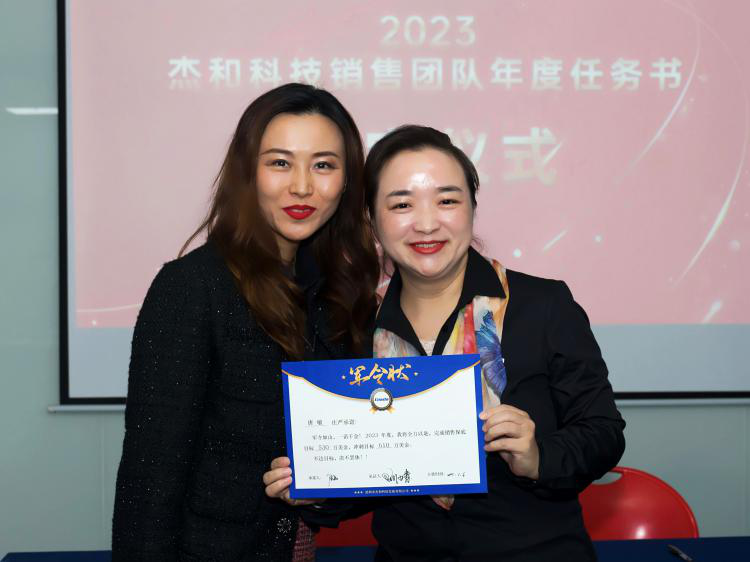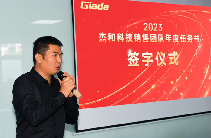 销售目标签约仪式上销售人员的激情和昂扬斗志,各职能部门的负责人也不甘示弱,智能硬件开发部总监李华东上台表示:新的一年产品和研发会在产品线上持续丰富,同时以销售目标为导向来打造高品质产品线,打造强有力的研发团队,做到让销售精英们无后顾之忧!