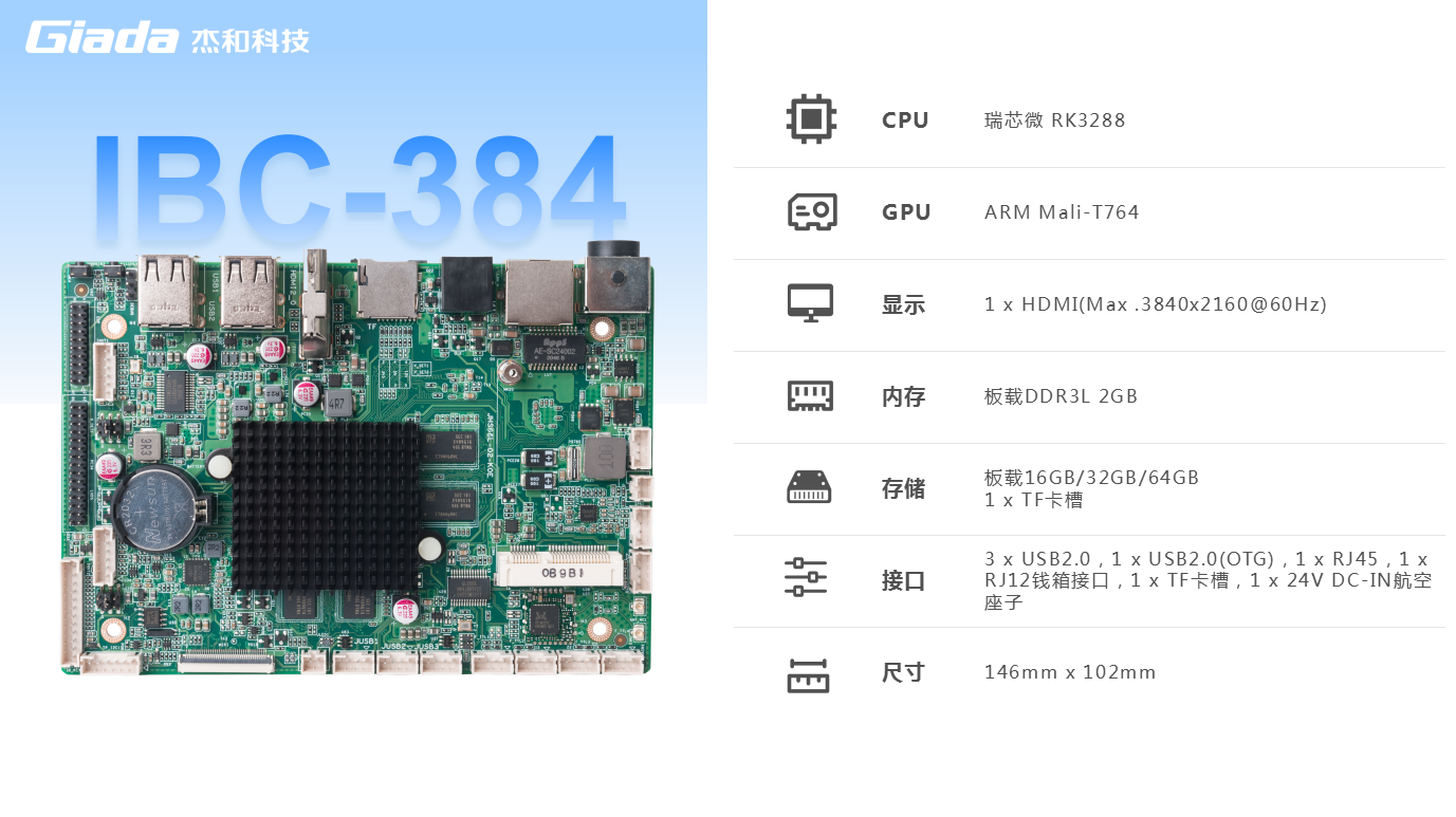 南宫NG·28(中国)相信品牌力量IBC-384主板是一款紧凑的 3.5 英寸基于 ARM 架构的主板,搭载瑞芯微 RK3288 四核Cortex-A17处理器。内置 DDR3L 内存、eMMC5.1 存储、双频 WiFi 和蓝牙 4.2,确保在恶劣环境下稳定运行。适用于零售收银、工业控制、安防监控、POS 机等领域,IBC-384 集合了强大性能和可靠性。释放其潜能,提升项目,与这款高性能主板一起开启无限可能。