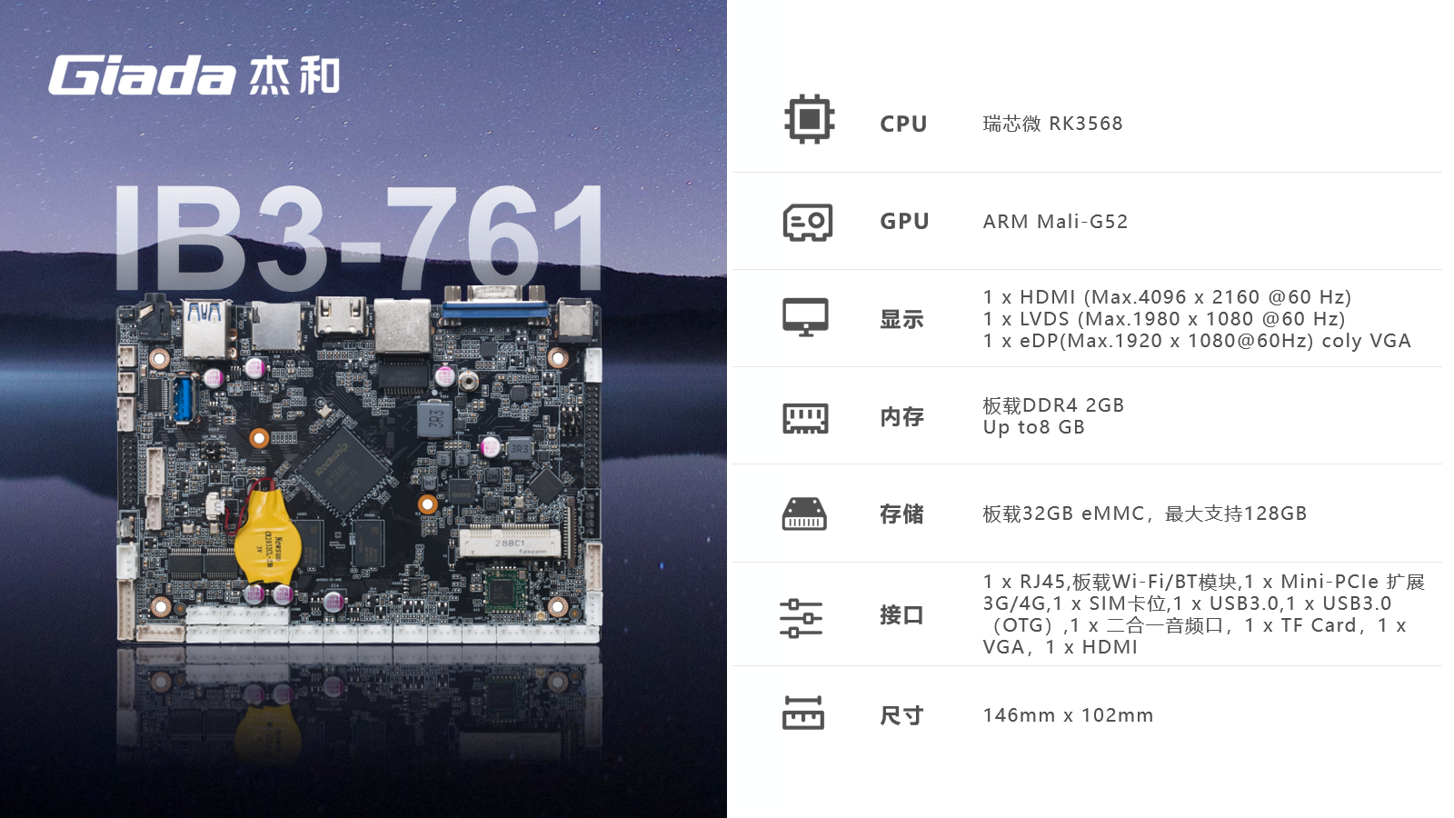 南宫NG·28(中国)相信品牌力量ARM主板IB3-761基于瑞芯微RK3568四核64位处理器开发,可实现多任务并行、更大数据集的高效处理,丰富的接口,具有性能强、内存大、集成度高、扩展能力强等特点,在处理速度和图形处理能力方面都表现出色,可广泛应用于物联网网关、边缘存储、工控平板、工业检测、工控盒、自助终端、云终端、车载中控、机器人等行业定制市场。