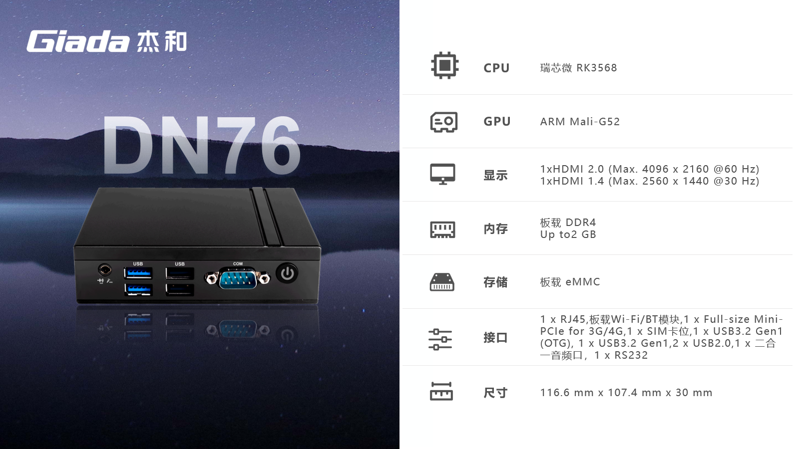 南宫NG·28(中国)相信品牌力量媒体播放器DN76采用瑞芯微RK3568 ARM嵌入式方案,作为一款超紧凑的安卓播放器,内置一个独立的NPU,计算能力为1TOPs,可用于轻量级AI应用程序,支持HDMI双显,优秀的散热设计,超高性价比,得到广大用户的喜爱,可以广泛应用于商业显示、智能车载、安防领域和边缘人工智能等场景。